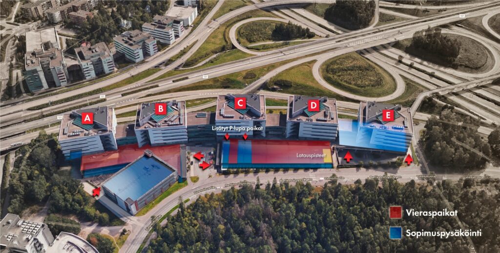 Olemme iloisia jokaisesta työmatkansa pyörällä kulkevasta vuokralaisestamme ja kannustamme ja tuemme tätä liikkumismuotoa. Kiinteistön polkupyöräkatokset sijaitsevat pääsisäänkäynnin puoleisissa väliköissä. Pääsisäänkäynnin viereinen katos on lukittu ja kulunvalvonnassa. Sähköpyörien lataus onnistuu C-talon puoleisessa pyöräkatoksessa. Yhteiskäytössä olevat sosiaalitilat, käsittäen mm. pukuhuoneet, suihkut ja tavarakaapit sijaitsevat B -talon kellarissa.